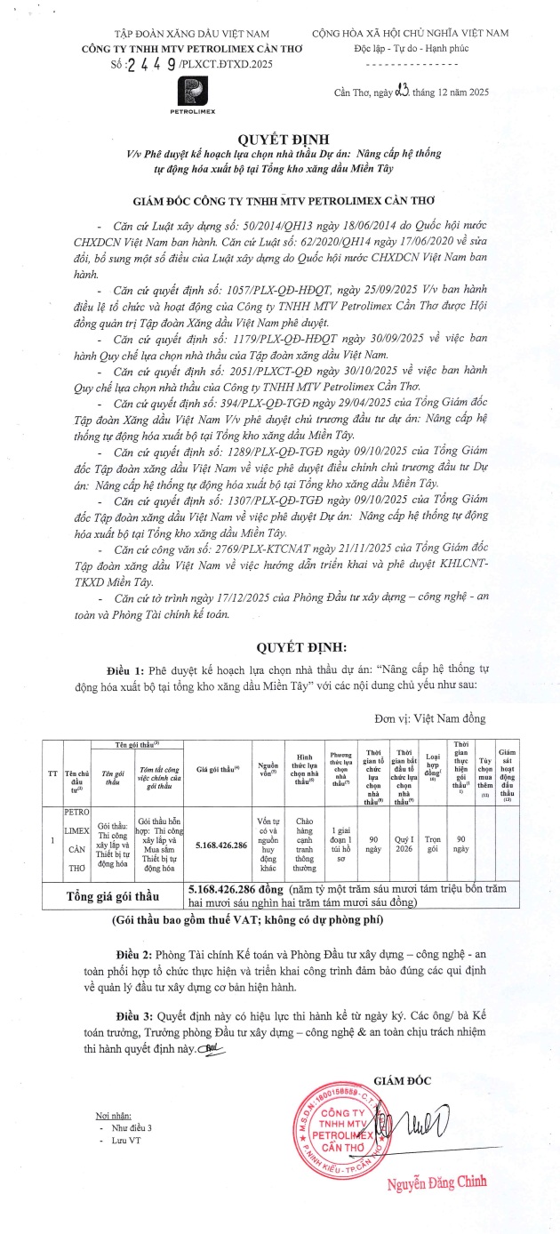 Quyết định số: 2449/PLXCT.ĐTXD.2025